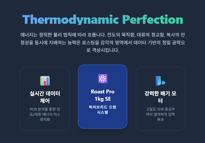 - Roast Pro 1kg SE의 정밀 제어: 본 기종은 최적화된 내부 3중 교반 날개(Vane)와 정밀한 RPM 조절 기능을 통해, 전도열이 특정 부위에 치우치지 않고 수천 알의 생두 표면에 균일한 '에너지 플럭스(Energy Flux)'를 전달하도록 설계되었습니다.