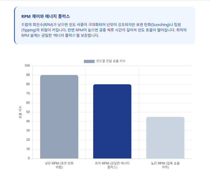 적절한 전도는 입안에서의 질감(Mouthfeel)을 풍성하게 만드는 핵심 요소입니다. - RPM(회전수)의 기하학과 에너지 플럭스: 드럼의 회전 속도는 생두가 드럼 바닥면의 고온 금속과 접촉하는 시간 및 빈도를 결정하는 결정적인 통제 장치입니다.
