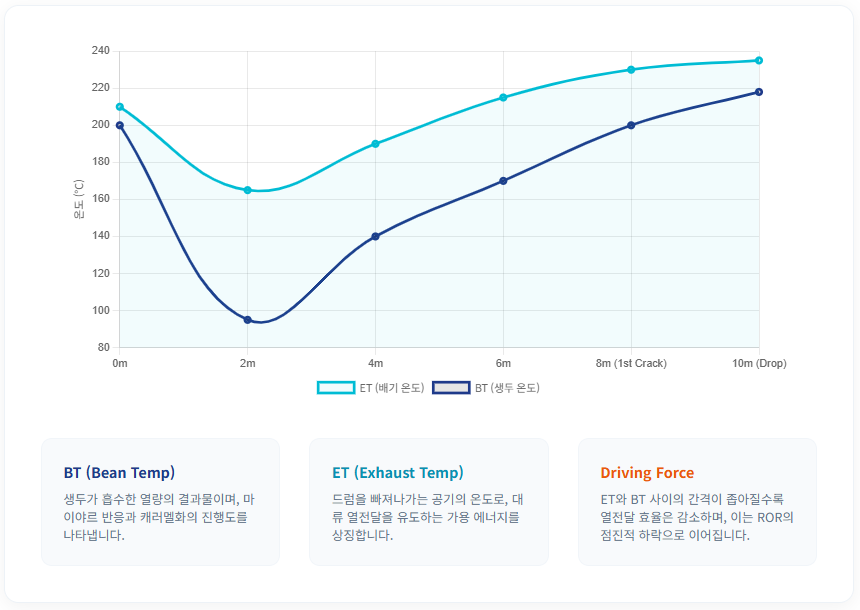 반면, 이 차이가 너무 크면 생두 표면이 타는 스콜칭(Scorching)현상이 발생할 수 있습니다. - 열적 평형으로의 수렴과 ROR의 관계: 로스팅이 진행됨에 따라 BT가 상승하면서 ET와의 간격(ET - BT)이 필연적으로 좁아집니다.