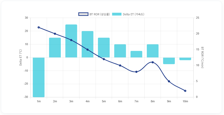 이는 로스팅 시스템의 에너지 변화율을 나타내는 '가속도' 지표이자, 화력 조절의 결과를 실시간으로 반영하는 거울입니다.