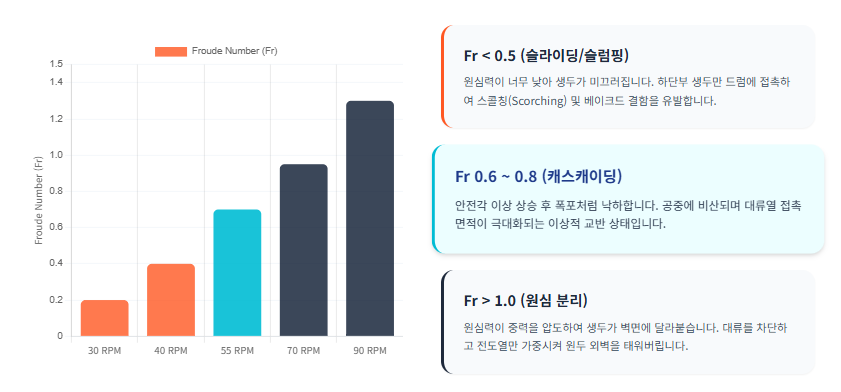 이때 생두는 공중에 비산되면서 고온의 대류열과 접촉하는 표면적을 극대화하며, 입자 간의 무작위 혼합(Random Mixing)이 가장 활발하게 일어납니다. - 원심 분리 및 위성 상태 (High RPM, Fr > 1.0): RPM이 임계점을 넘으면 원심력이 중력을 압도하여 생두가 드럼 벽면에 완전히 달라붙어 회전합니다.