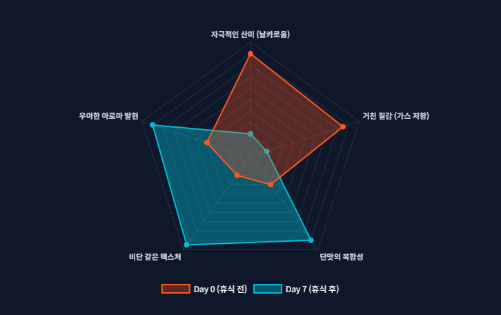 로스팅 직후의 원두로 에스프레소를 내리면 크레마는 거칠고 두껍게 부풀어 오르지만, 정작 입안에서는 날카로운 금속성 산미와 거친 질감만이 느껴집니다.