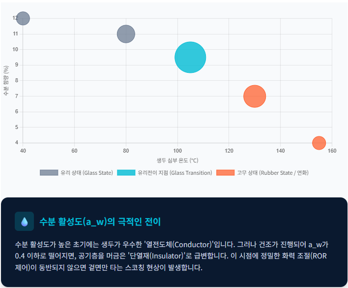 3. 물리적 구조 변화: 유리전이(Glass Transition)와 수분 활성도