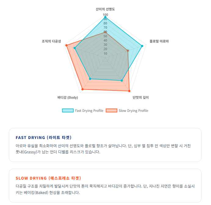 - Slow Drying (중배전 및 에스프레소 타겟):
