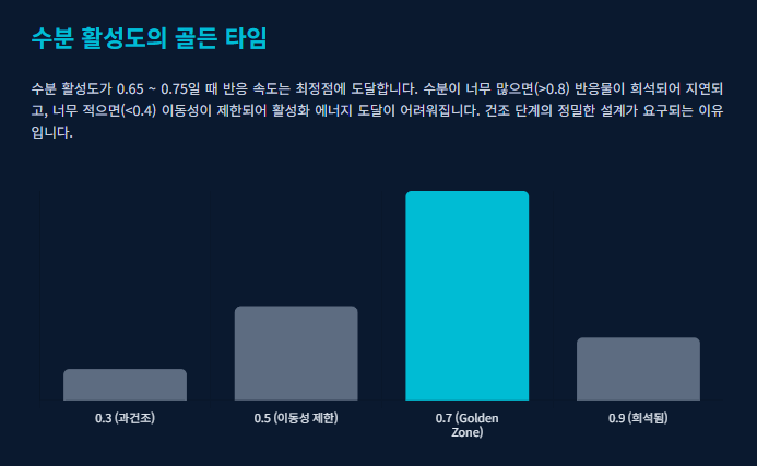 - 수분 과다(a_w > 0.8): 반응물들이 과도하게 희석되어 분자 간 충돌 횟수가 줄어듭니다.