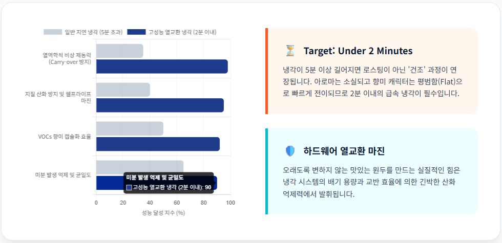 꿩 잡는 게 매라는 말처럼, 복잡한 냉각 이론을 구구절절 나열하는 것보다 중요한 성과는 결국 오래도록 변하지 않는 맛있는 원두를 만들어내는 실질적인 힘이며, 이는 오직 냉각의 긴박함 속에서만 확보될 수 있습니다.