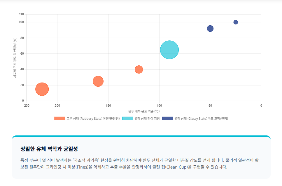 1차 크랙에서 폭발적으로 팽창했던 원두의 세포벽(Cellulose Matrix)은 배출 직후 매우 유연하고 불안정한 고무 상태(Rubbery State)에 있습니다.